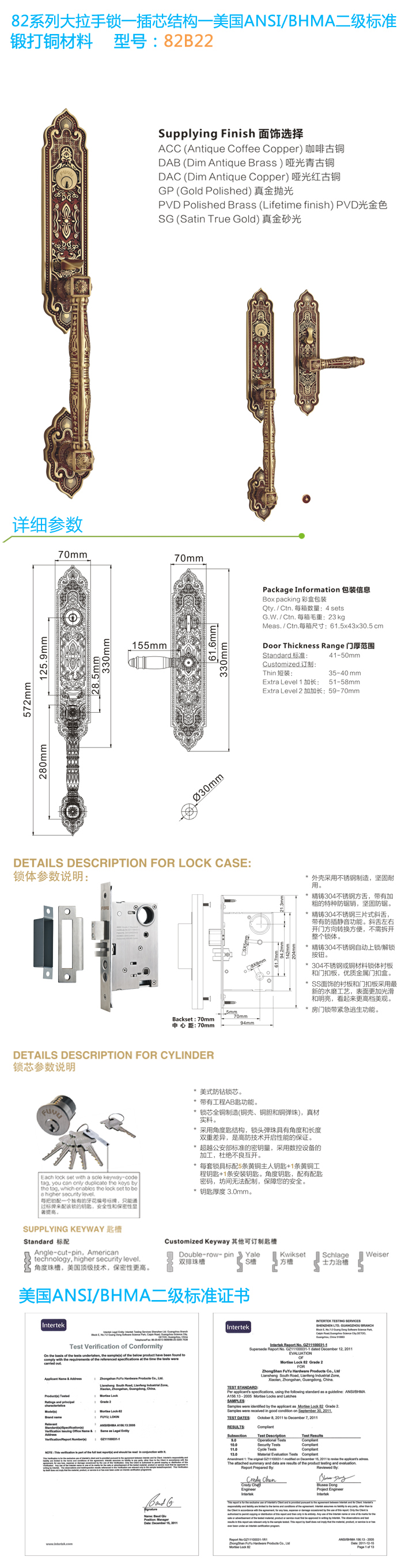 - * 通過(guò)美國(guó)ANSI/BHMA GRADE二級認證